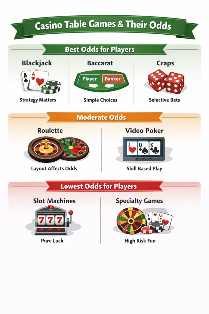 Casino table games such as blackjack and baccarat generally offer better odds because their rules and decision structures reduce the casino’s built-in advantage compared to outcome-only games like slots.